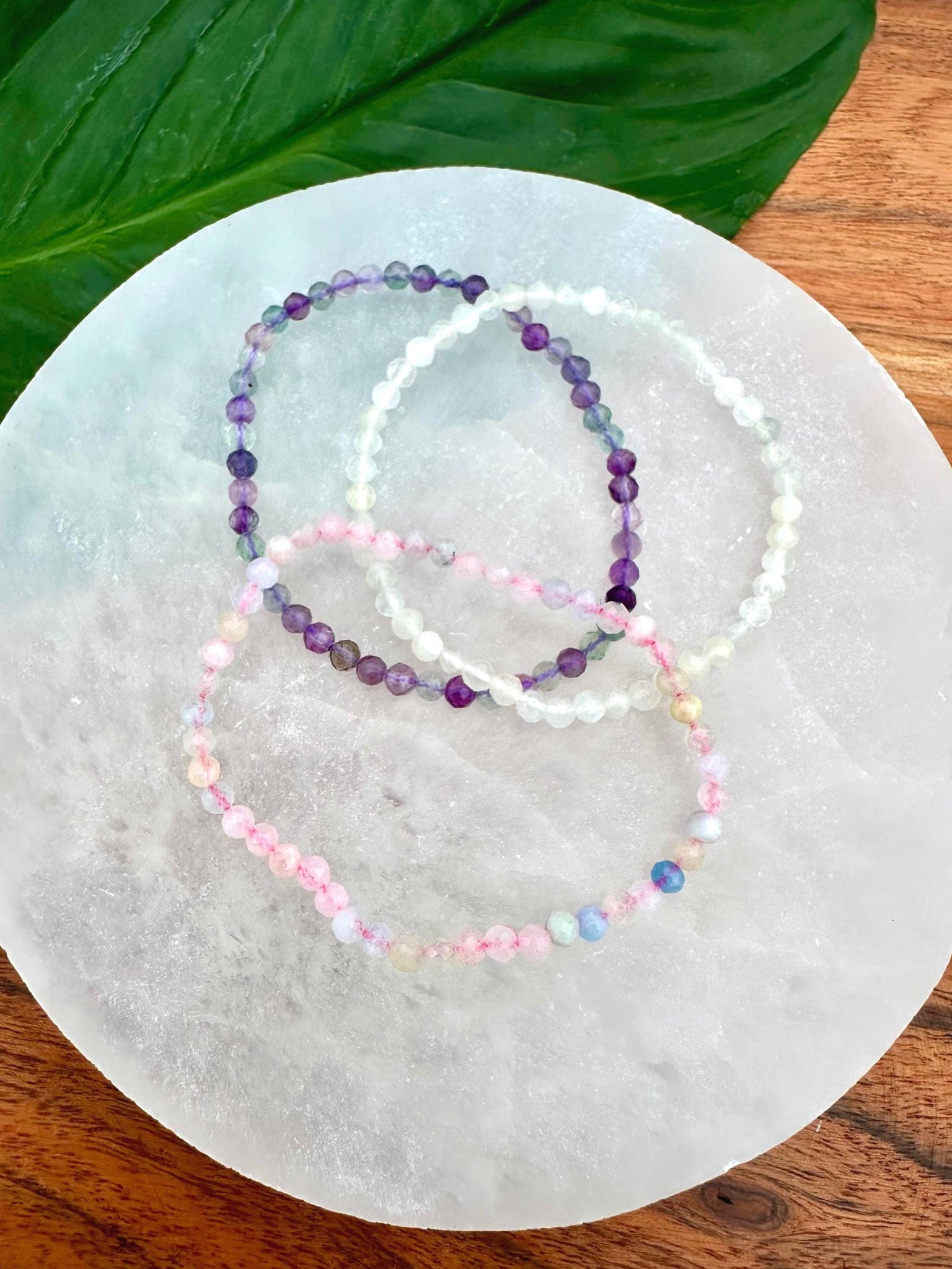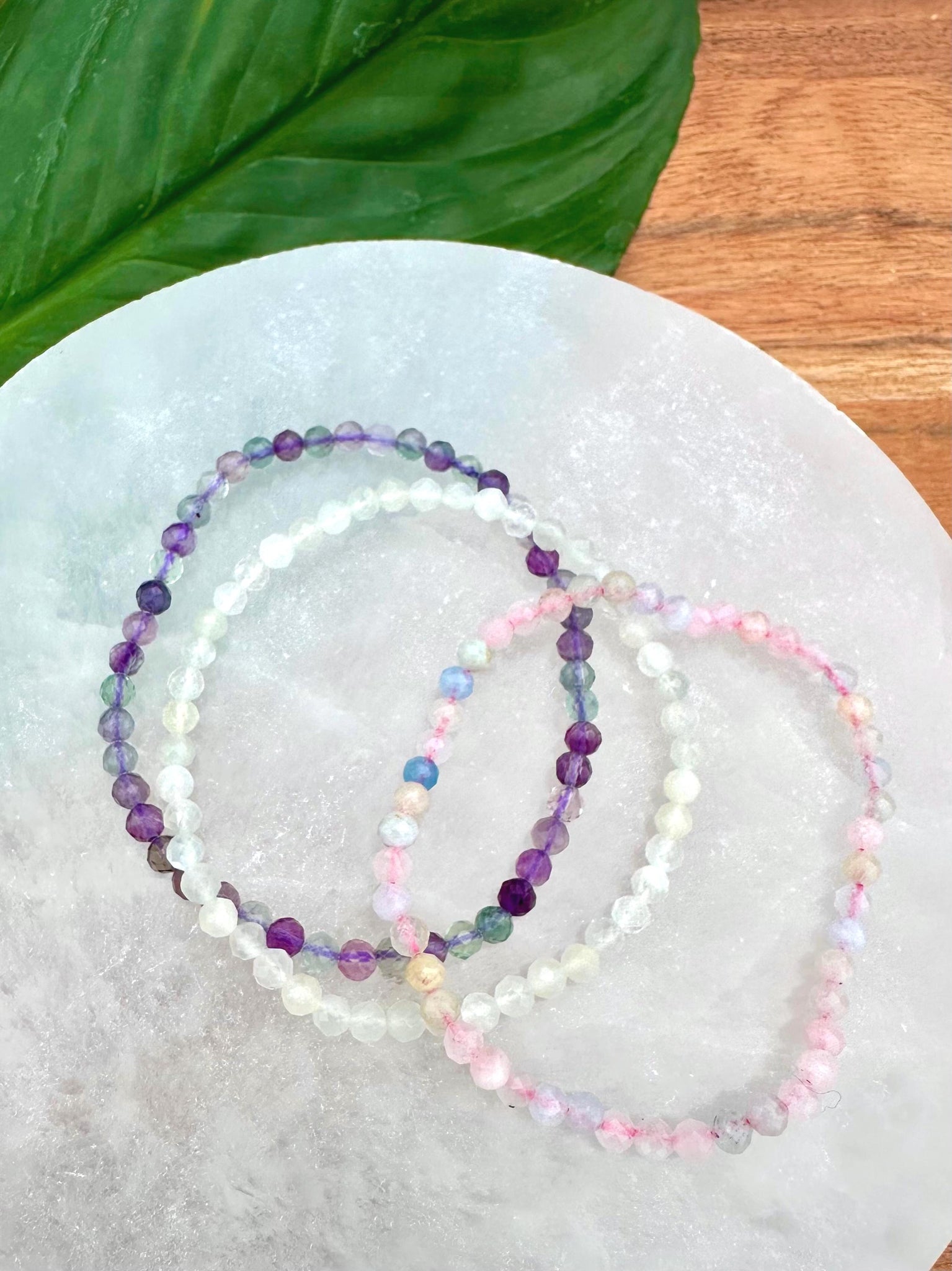 This 3-piece bracelet set has been intuitively curated to support the intentions of increasing intuition and providing emotional balance. The crystal varieties included in this set are: Fluorite, Moonstone and Morganite.