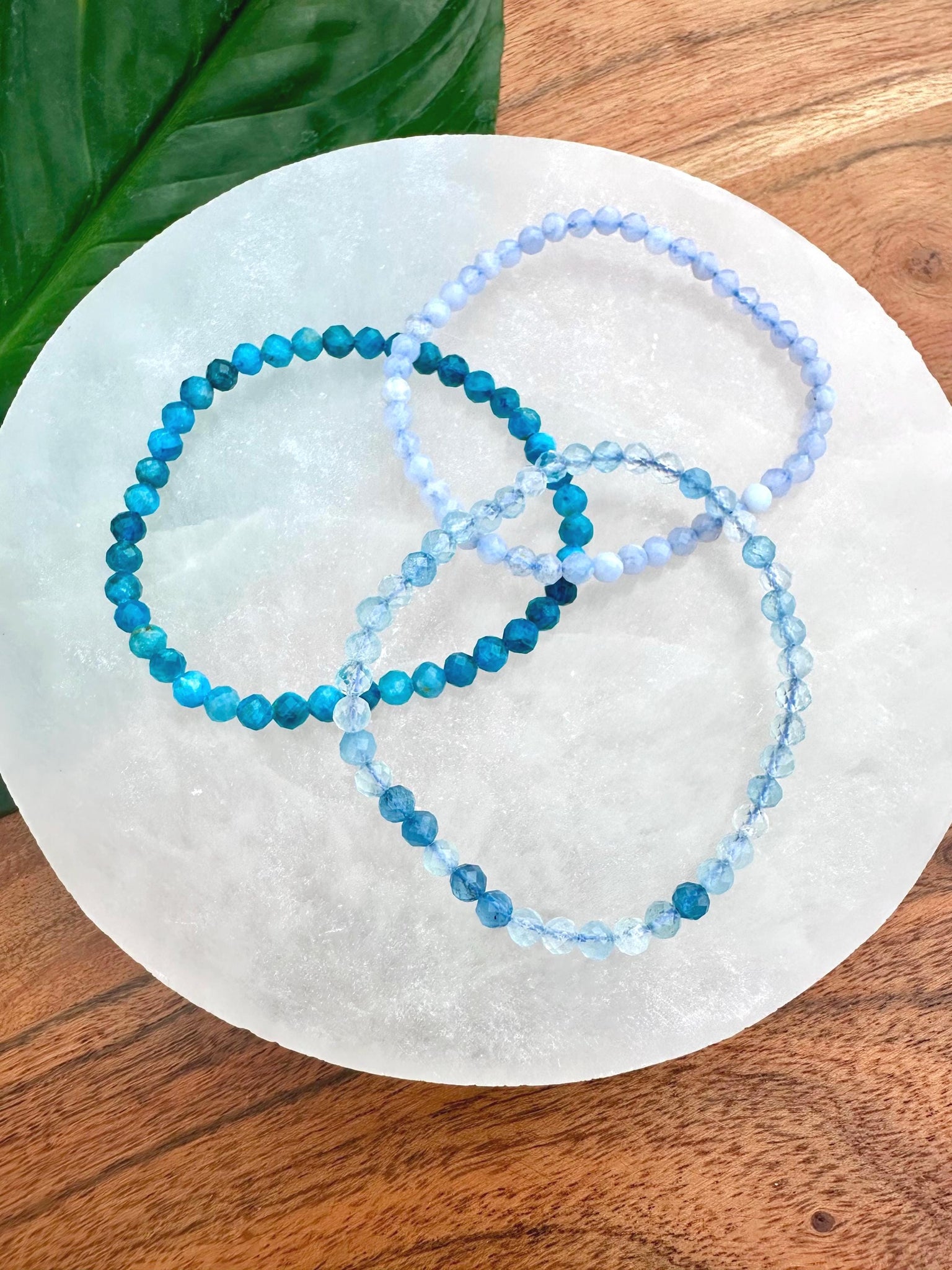 This 3-piece bracelet set has been intuitively curated to support the intentions of supporting self-expression and clarity. The crystal varieties included in this set are: Apatite, Aquamarine, Blue Lace Agate