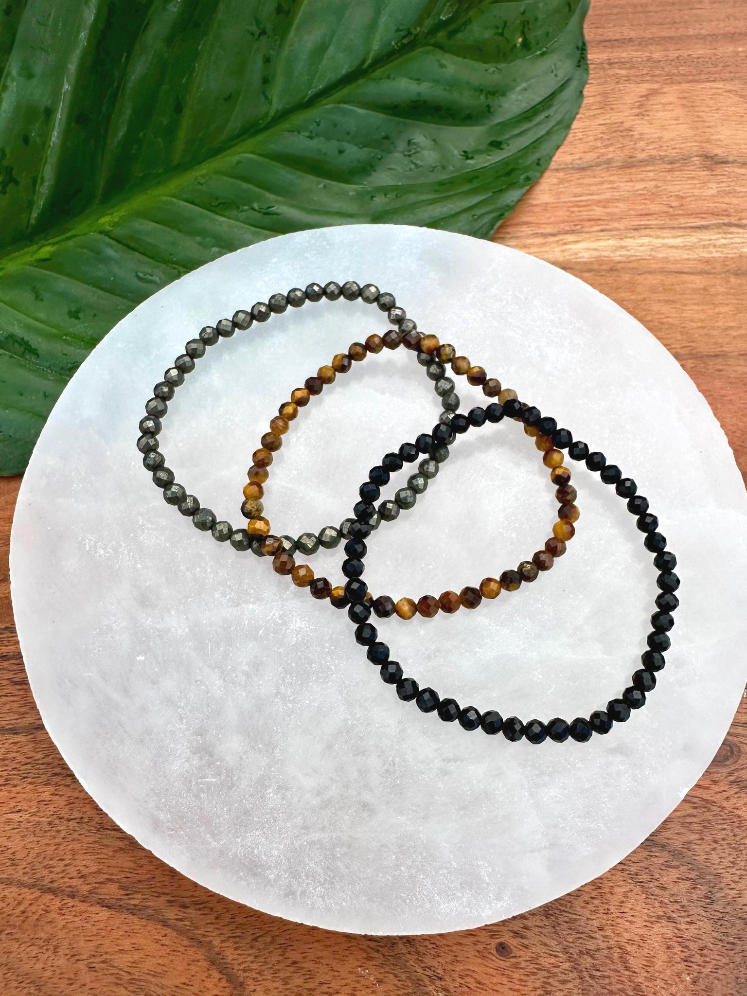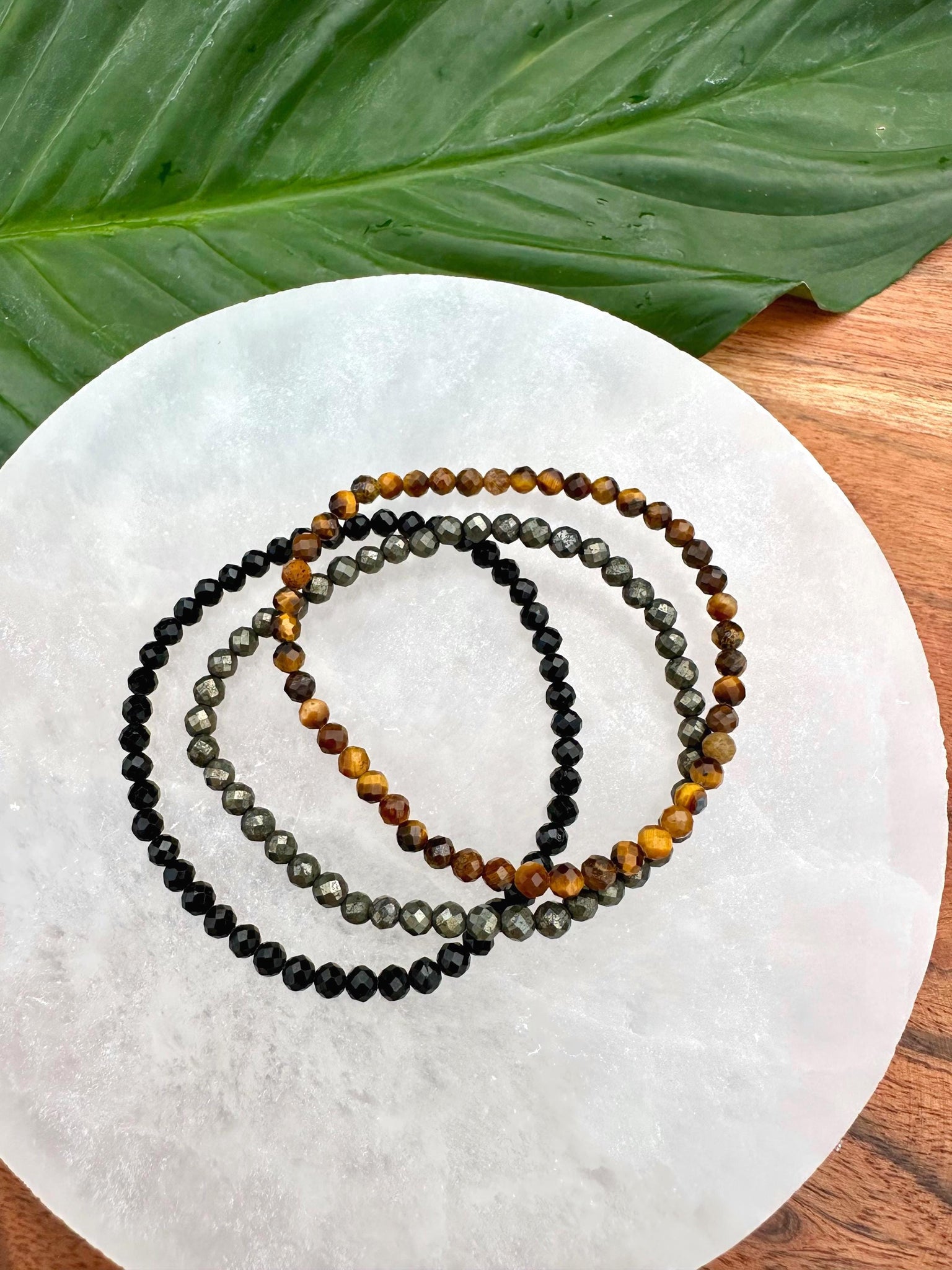 This 3-piece bracelet set has been intuitively curated to support the intentions of providing protection and grounding. The crystal varieties included in this set are: Black Tourmaline, Tiger Eye & Pyrite