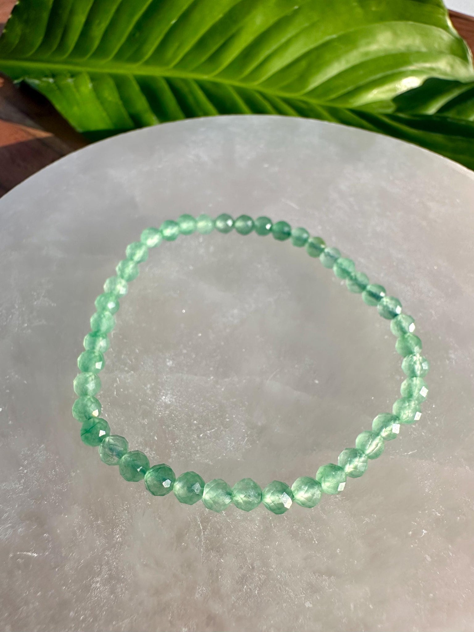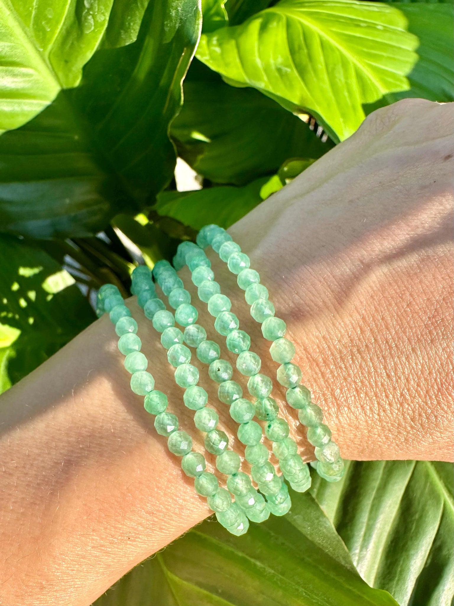 This Green Aventurine gemstone bracelet is made with 100% natural 4mm faceted crystal beads. This piece will fit all standard wrist sizes 5 1/2 - 7 inches and is made with a durable heavy-duty elastic cord.