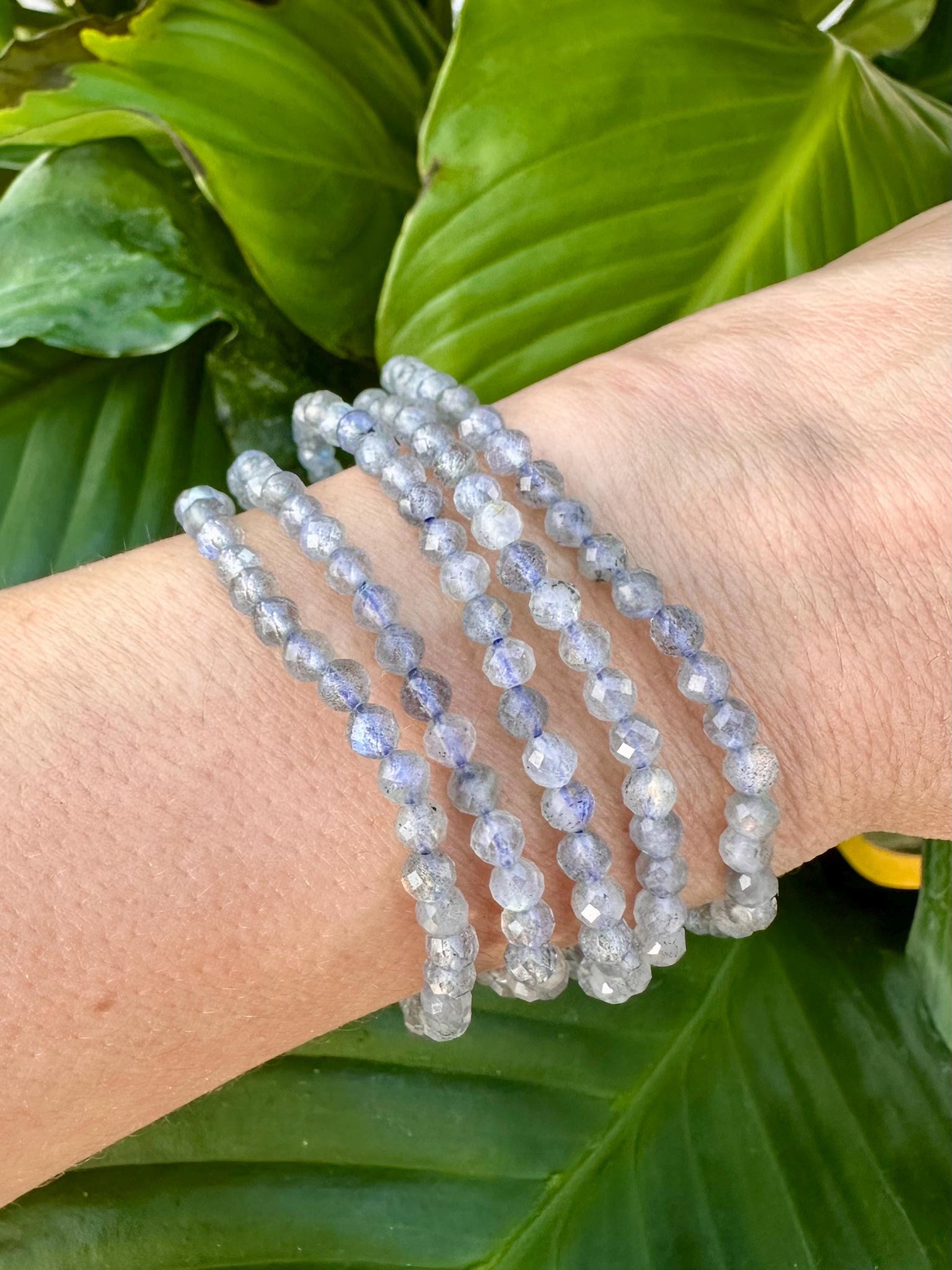 This Labradorite gemstone bracelet is made with 100% natural 4mm faceted crystal beads. This piece will fit all standard wrist sizes 5 1/2 - 7 inches and is made with a durable heavy-duty elastic cord.