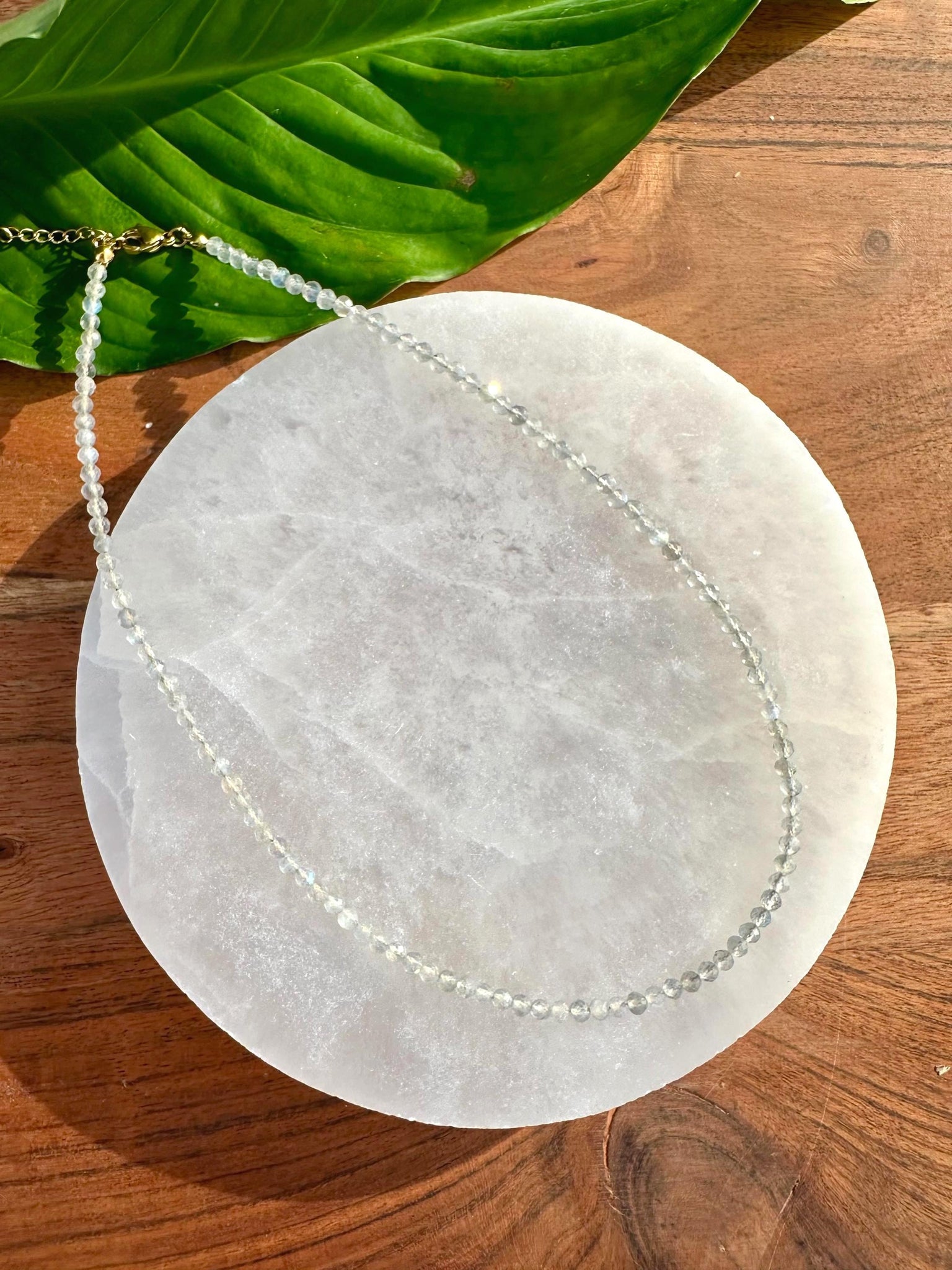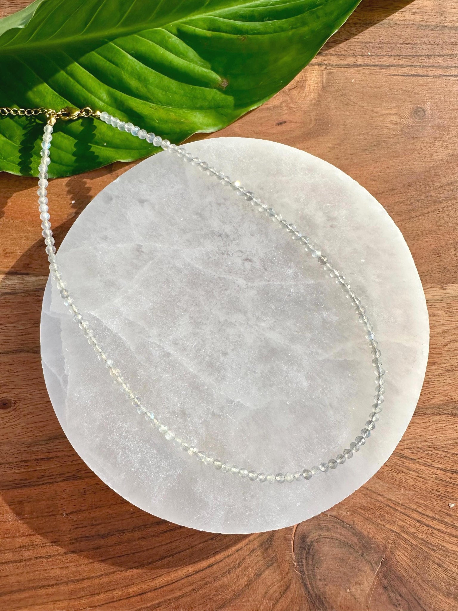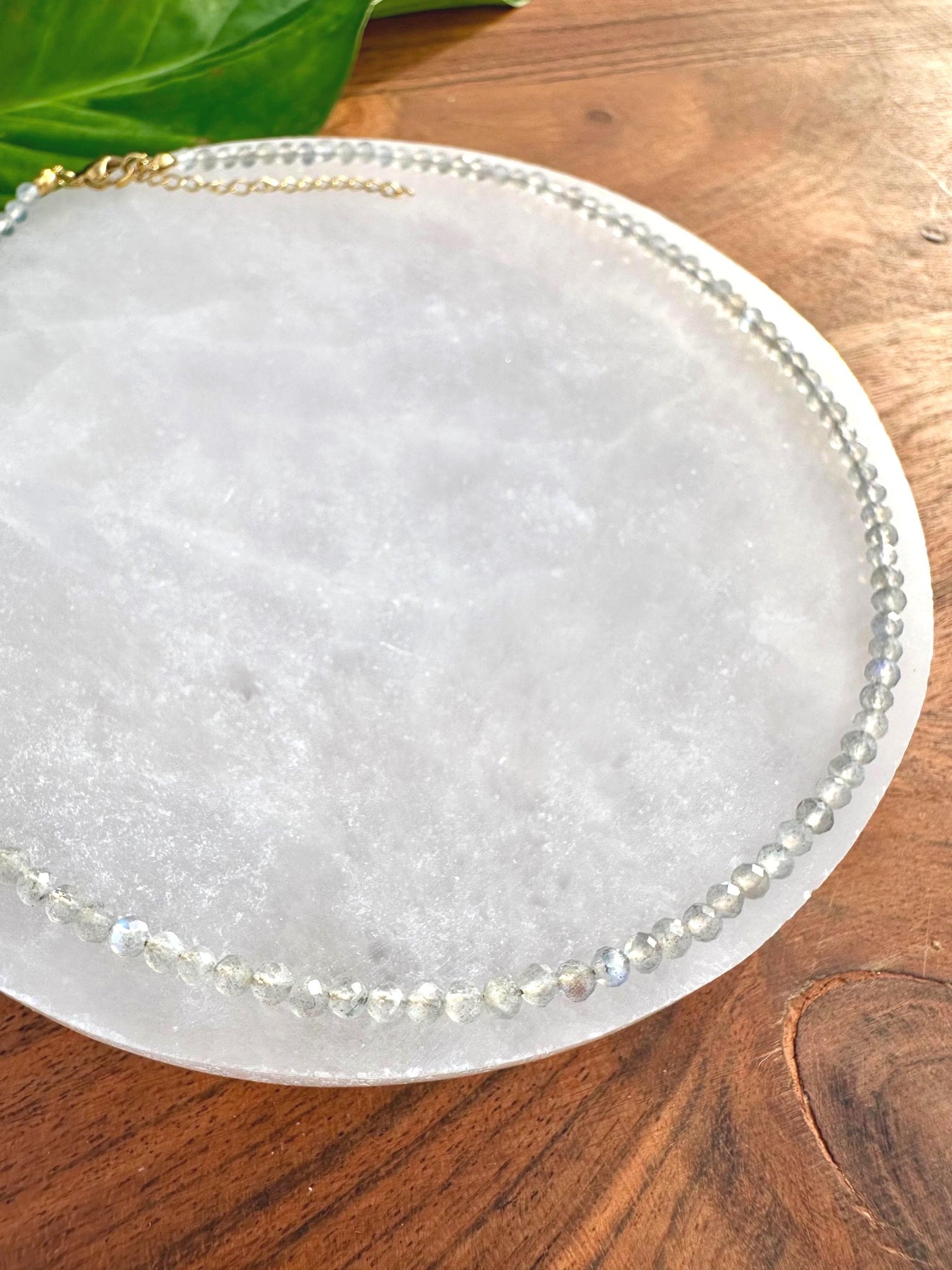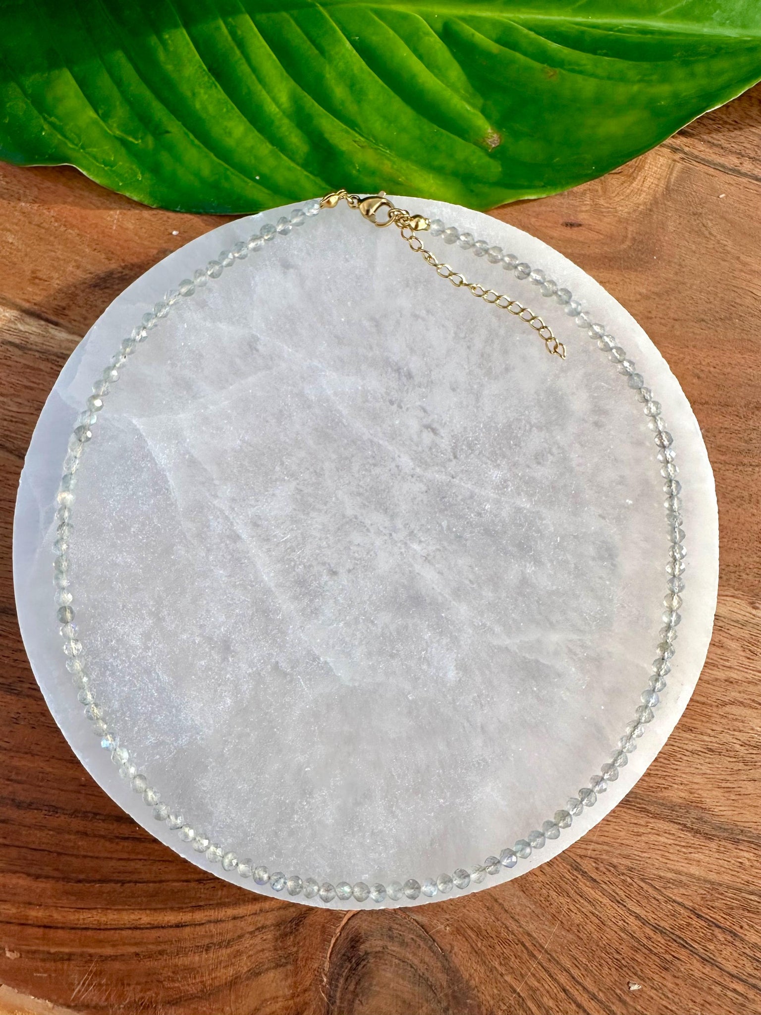 This Labradorite Crystal Necklace is made of 100% natural Grade A 2-3mm faceted beads. This necklace wears like a choker at 14 inches in length, resting at the base of the neck, just above the collarbone. It can be extended to 16 inches with a 2 inch extender according to your preference.