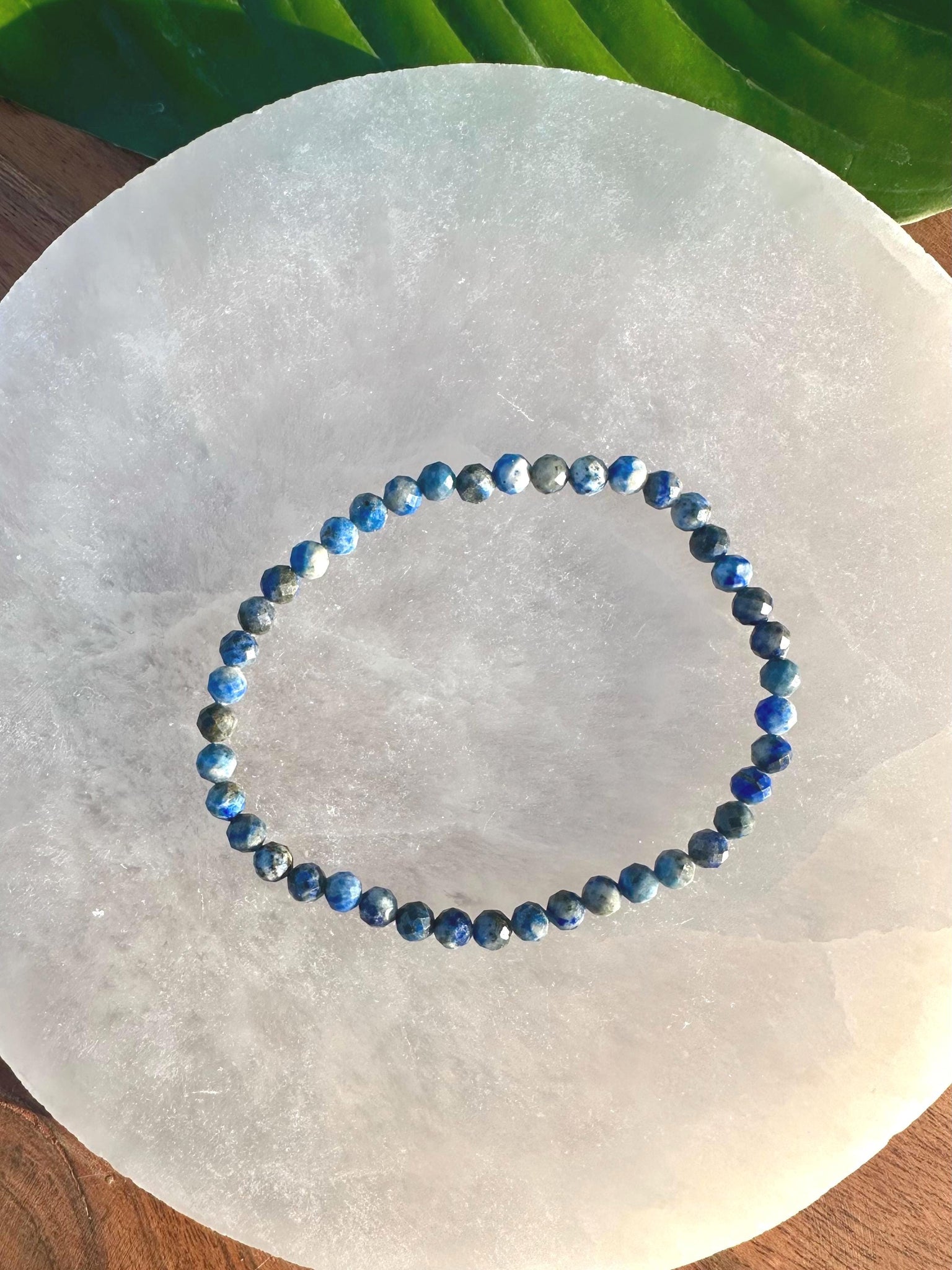 This Lapis Lazuli gemstone bracelet is made with 100% natural 4mm faceted crystal beads. This piece will fit all standard wrist sizes 5 1/2 - 7 inches and is made with a durable heavy-duty elastic cord.
