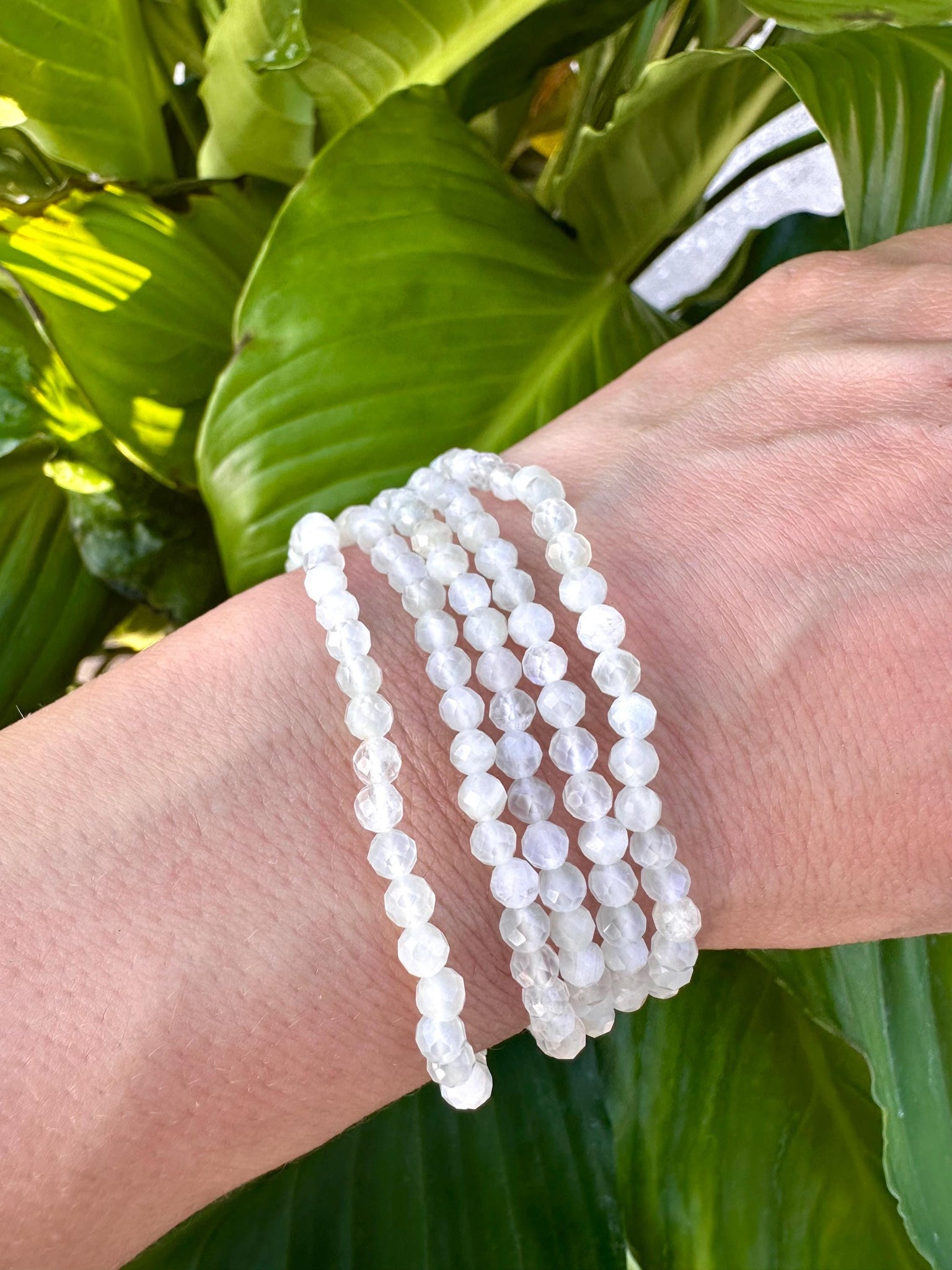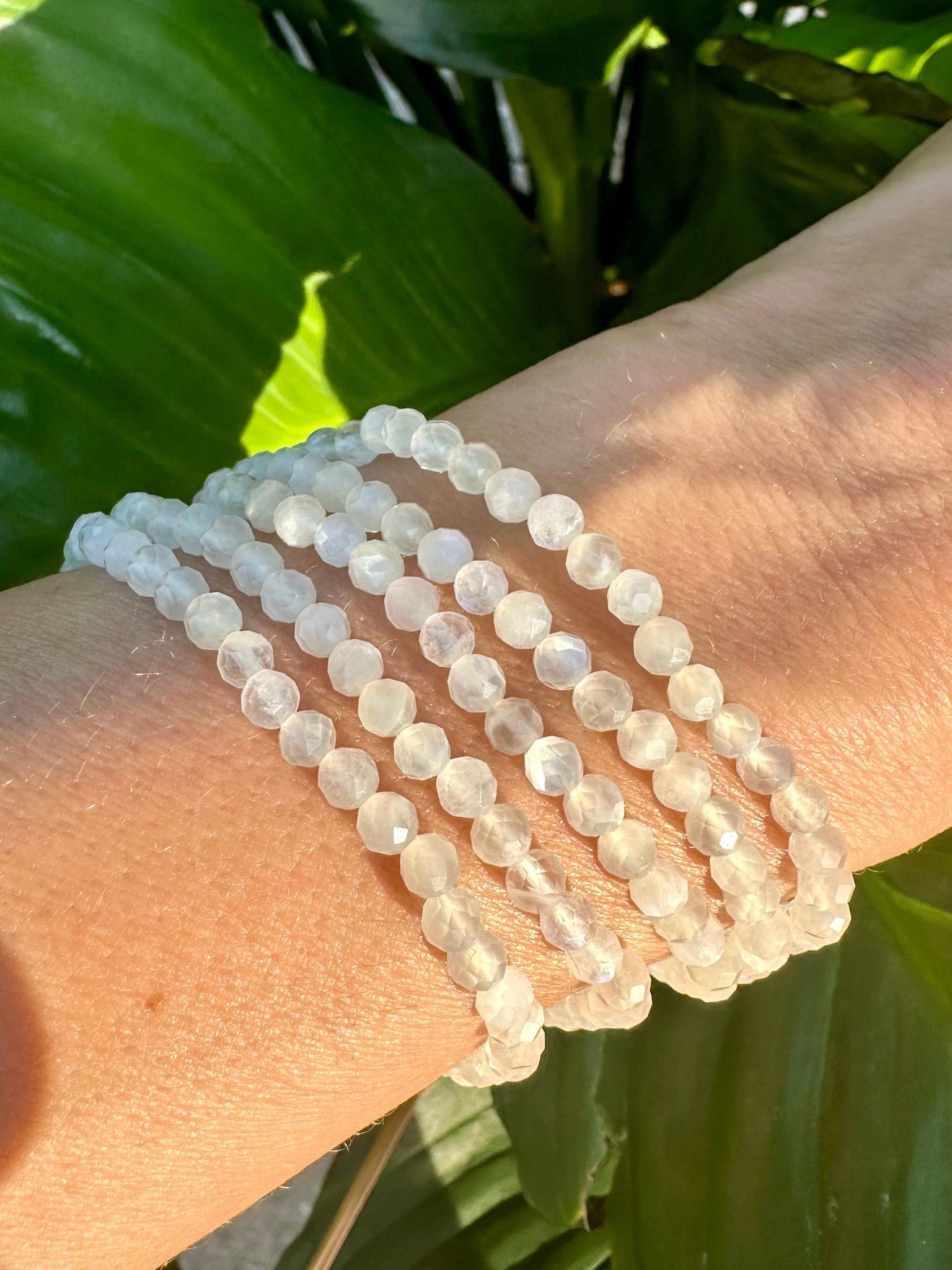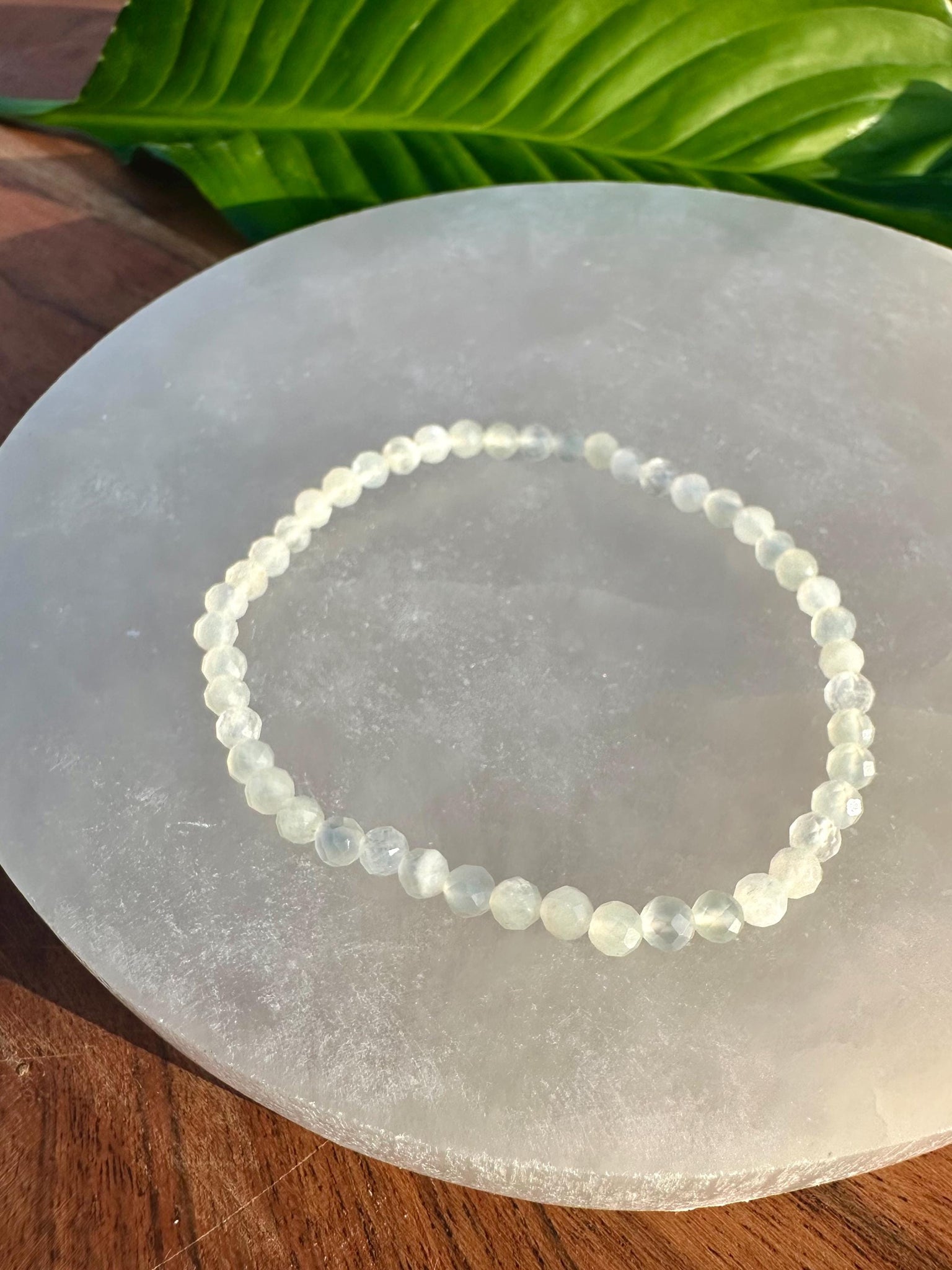 This Moonstone gemstone bracelet is made with 100% natural 4mm faceted crystal beads. This piece will fit all standard wrist sizes 5 1/2 - 7 inches and is made with a durable heavy-duty elastic cord.