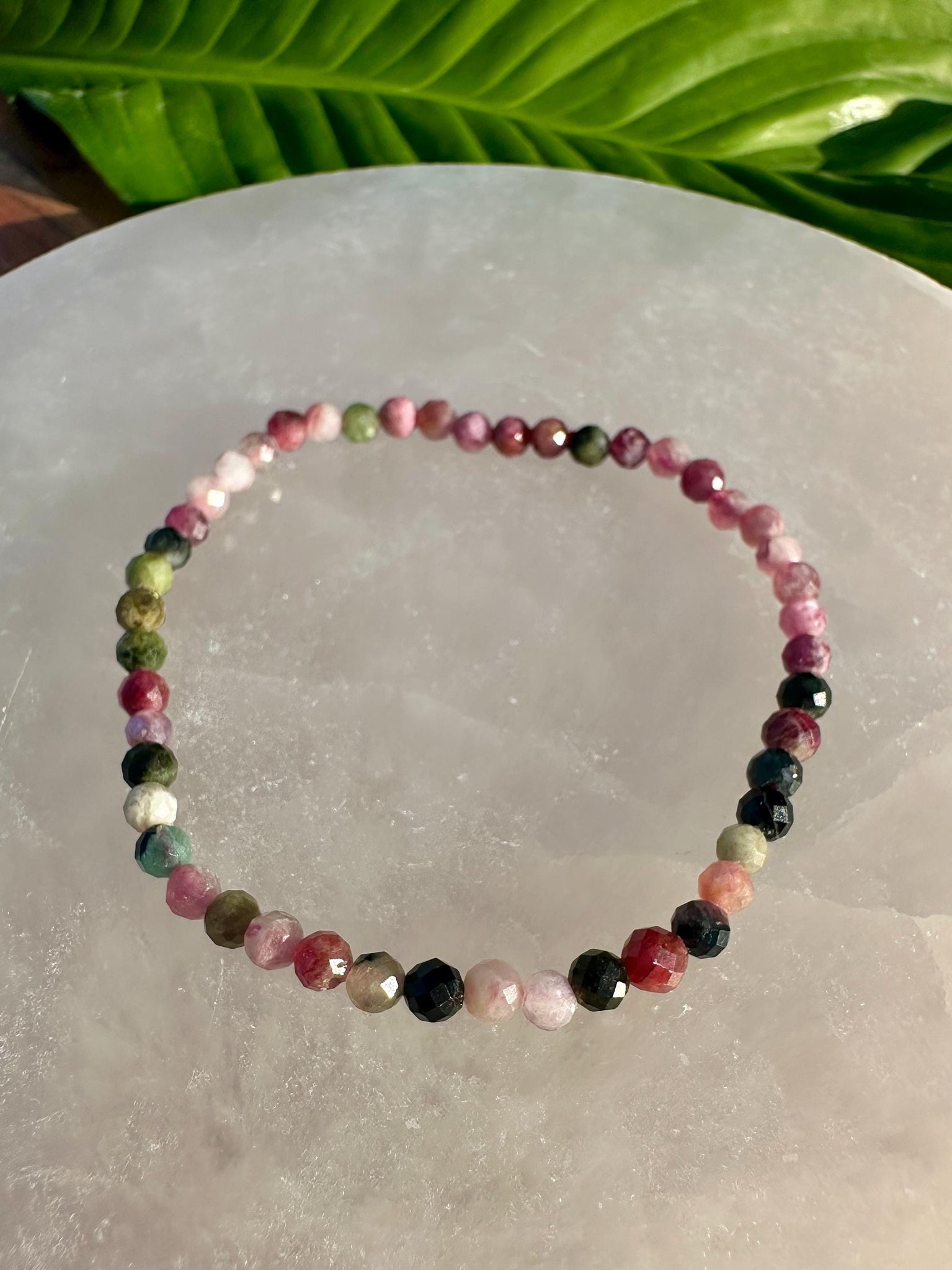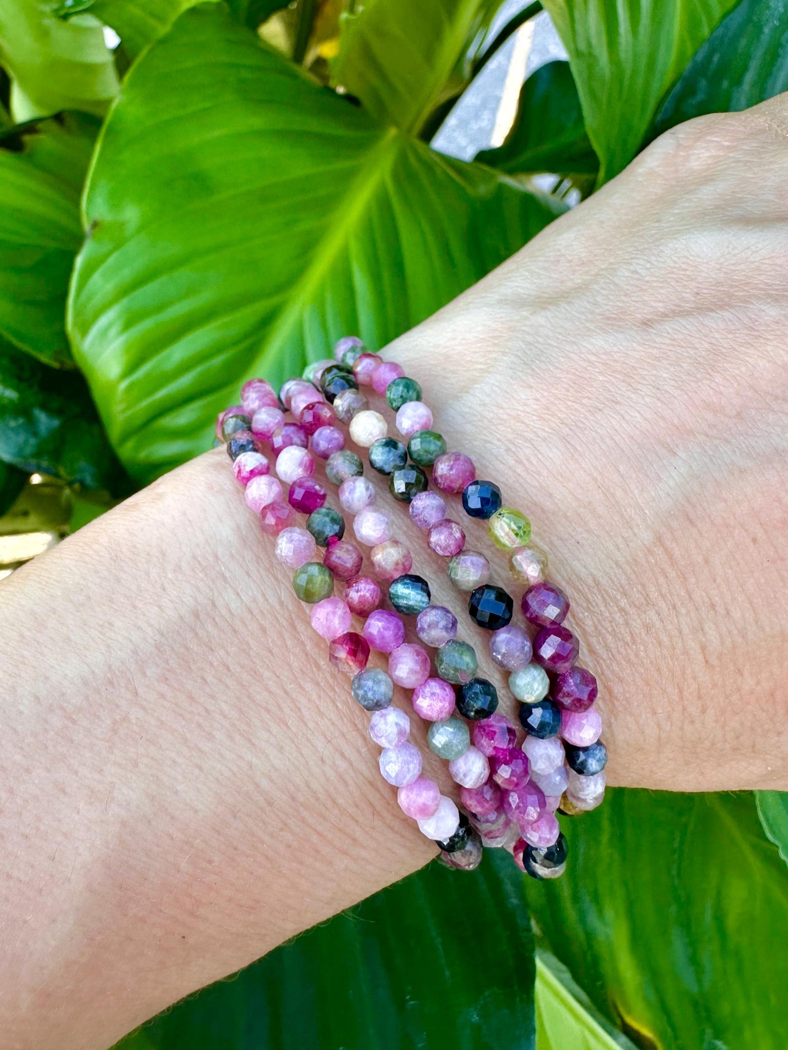This Rainbow Tourmaline gemstone bracelet is made with 100% natural 4mm faceted crystal beads. This piece will fit all standard wrist sizes 5 1/2 - 7 inches and is made with a durable heavy-duty elastic cord.