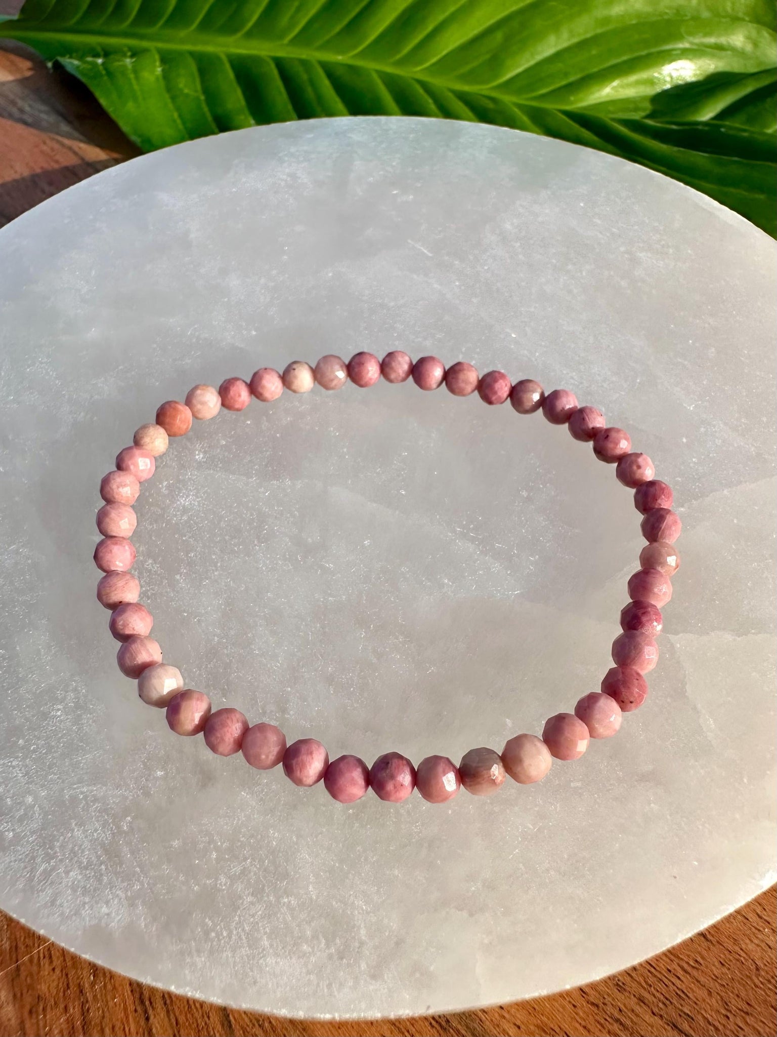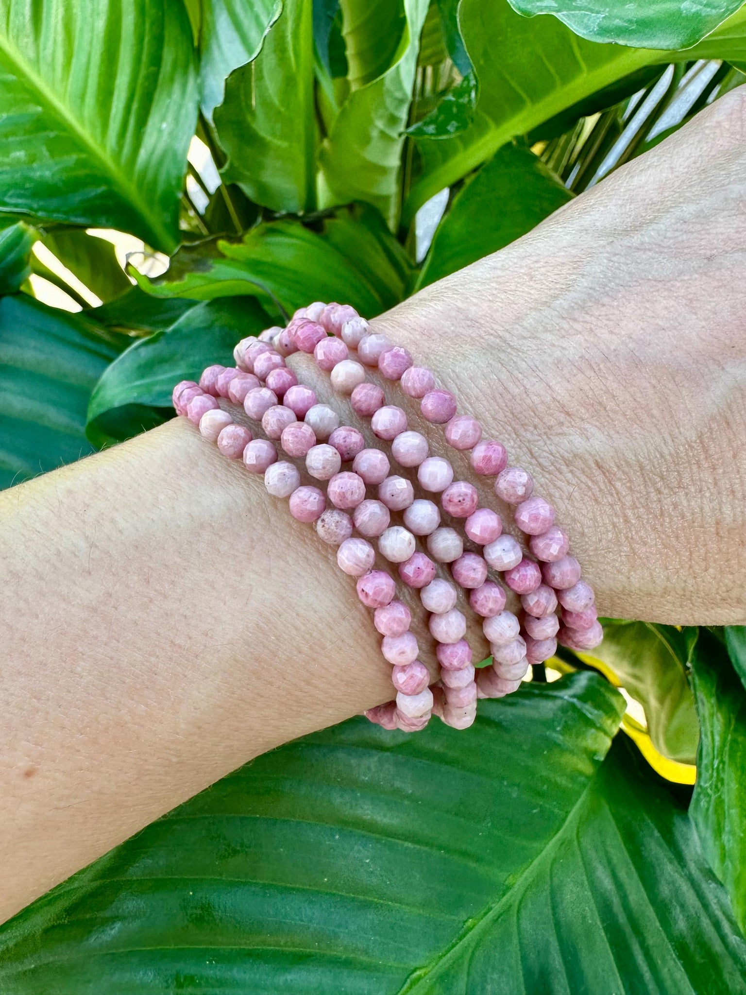 This Rhodonite gemstone bracelet is made with 100% natural 4mm faceted crystal beads. This piece will fit all standard wrist sizes 5 1/2 - 7 inches and is made with a durable heavy-duty elastic cord.
