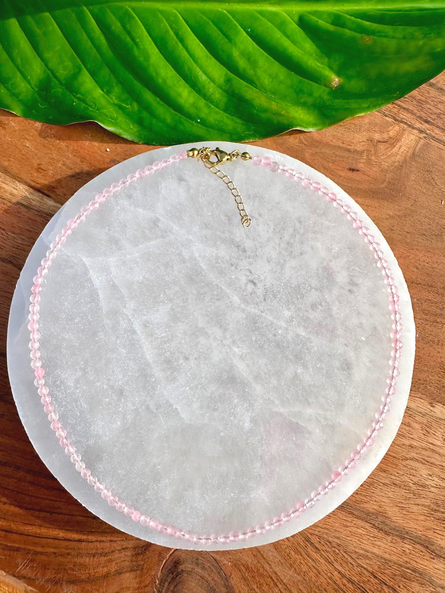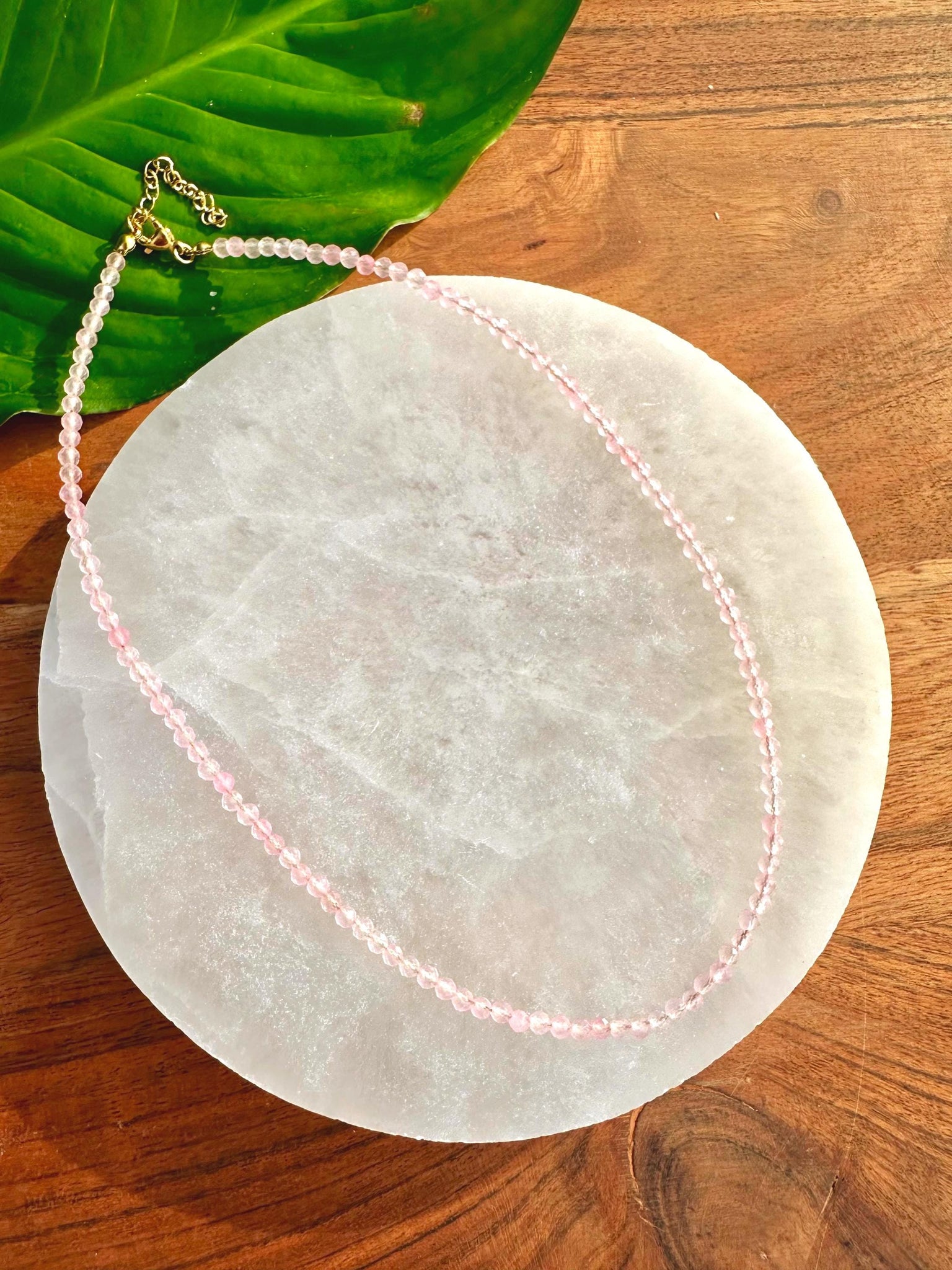 This Rose Quartz Crystal Necklace is made of 100% natural Grade A 2-3mm faceted beads. This necklace wears like a choker at 14 inches in length, resting at the base of the neck, just above the collarbone. It can be extended to 16 inches with a 2 inch extender according to your preference.