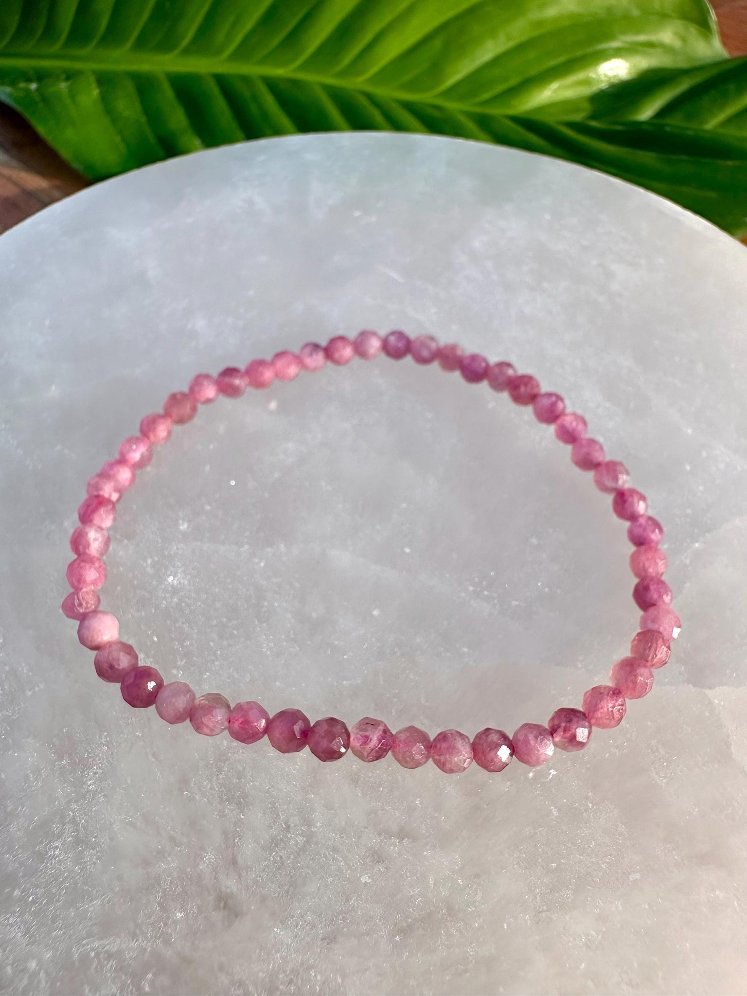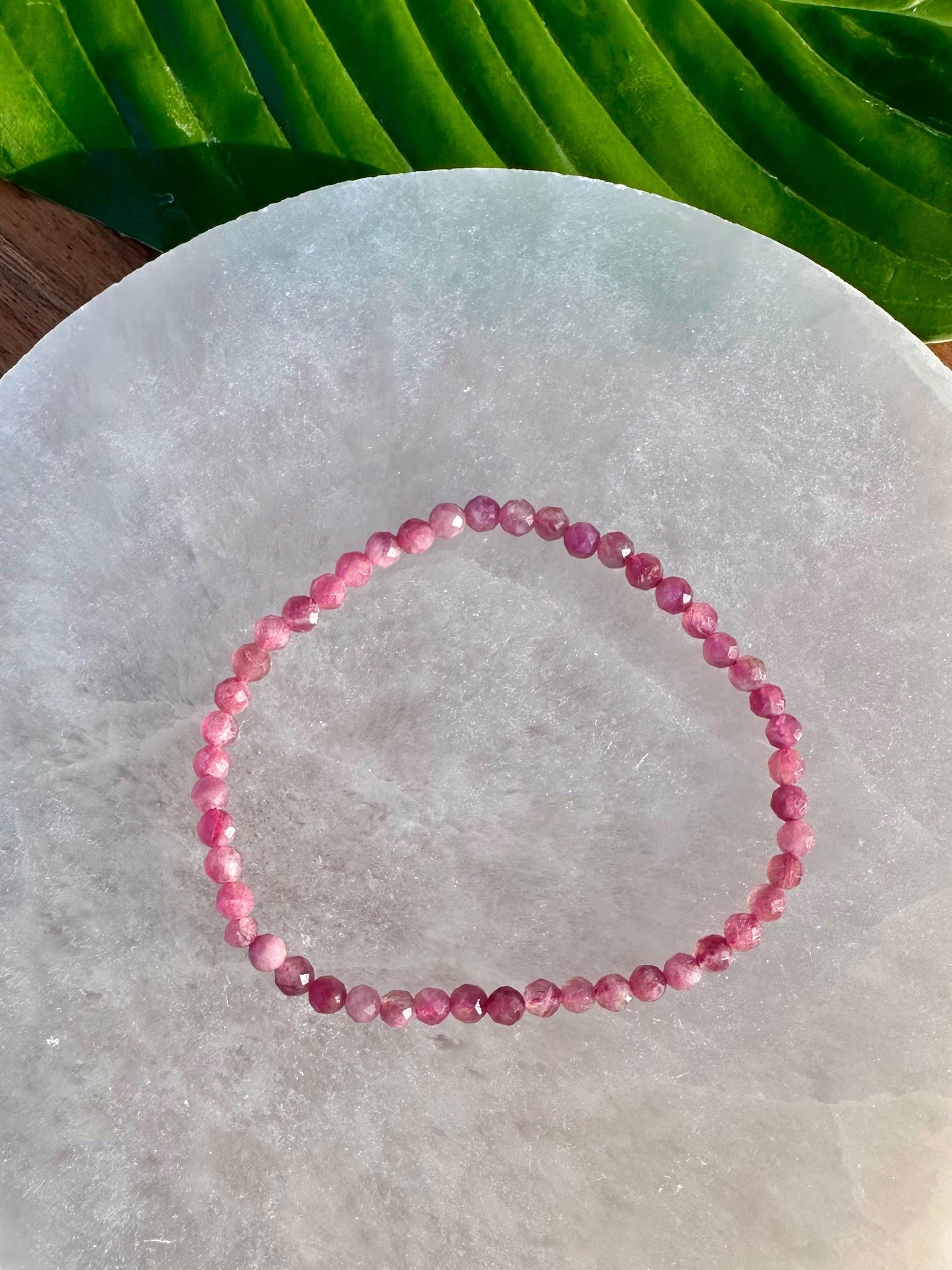 This Rubelite gemstone bracelet is made with 100% natural 4mm faceted crystal beads. This piece will fit all standard wrist sizes 5 1/2 - 7 inches and is made with a durable heavy-duty elastic cord.