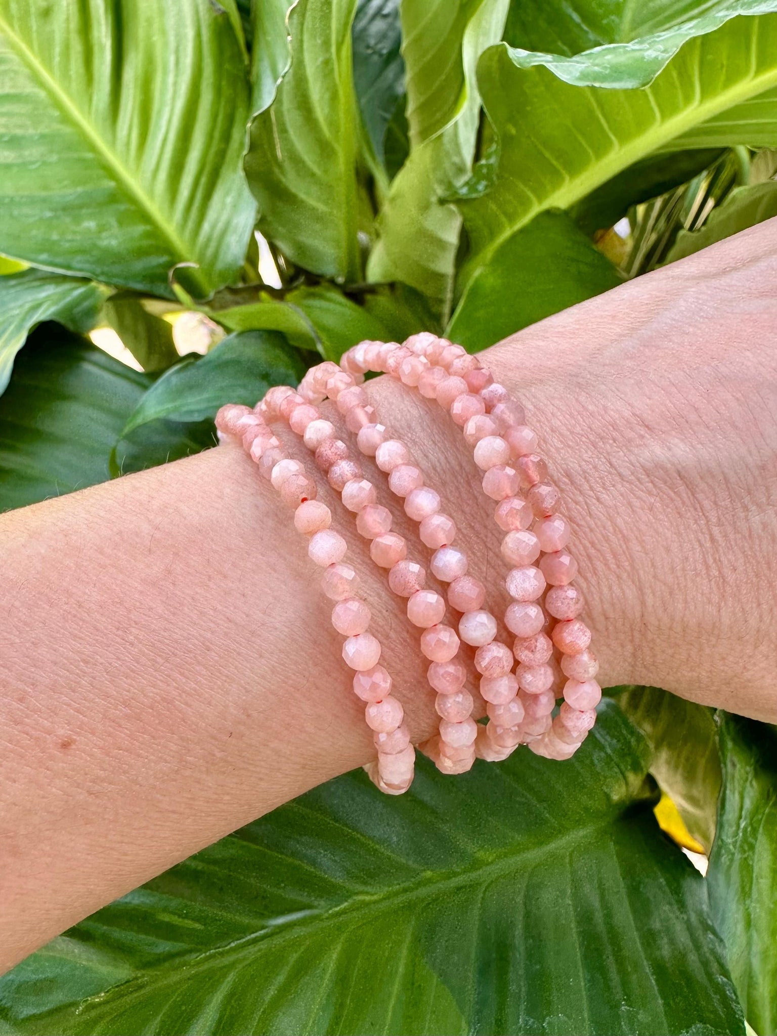This Sunstone gemstone bracelet is made with 100% natural 4mm faceted crystal beads. This piece will fit all standard wrist sizes 5 1/2 - 7 inches and is made with a durable heavy-duty elastic cord.