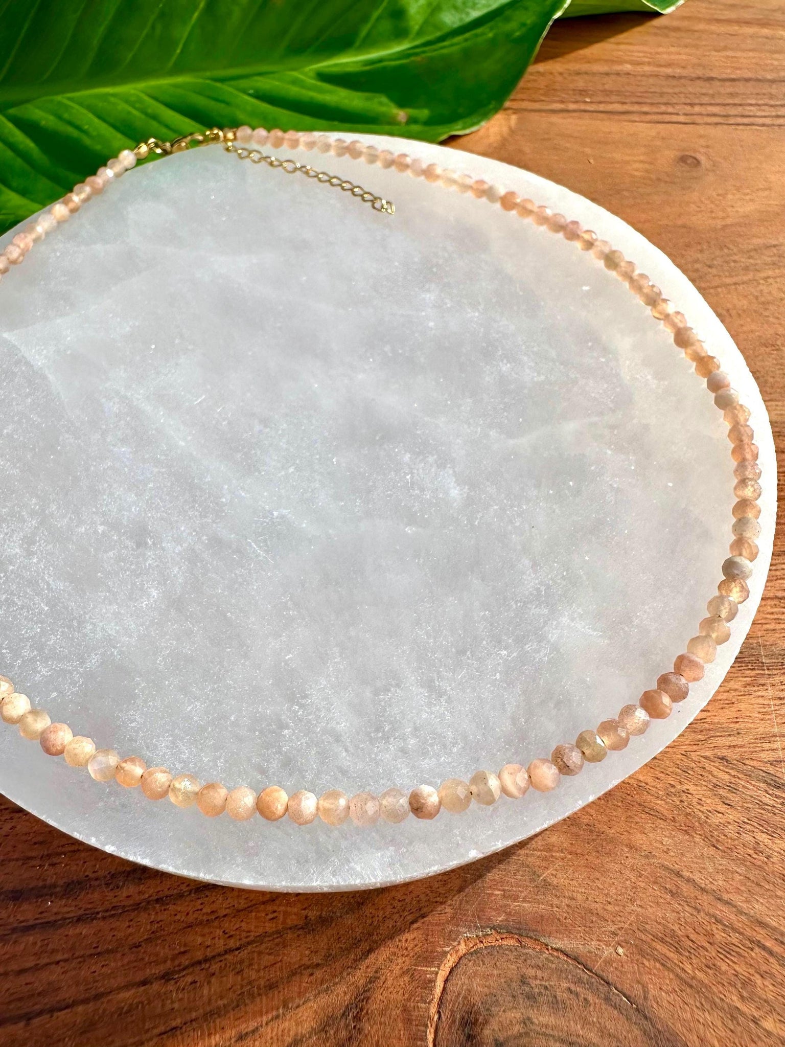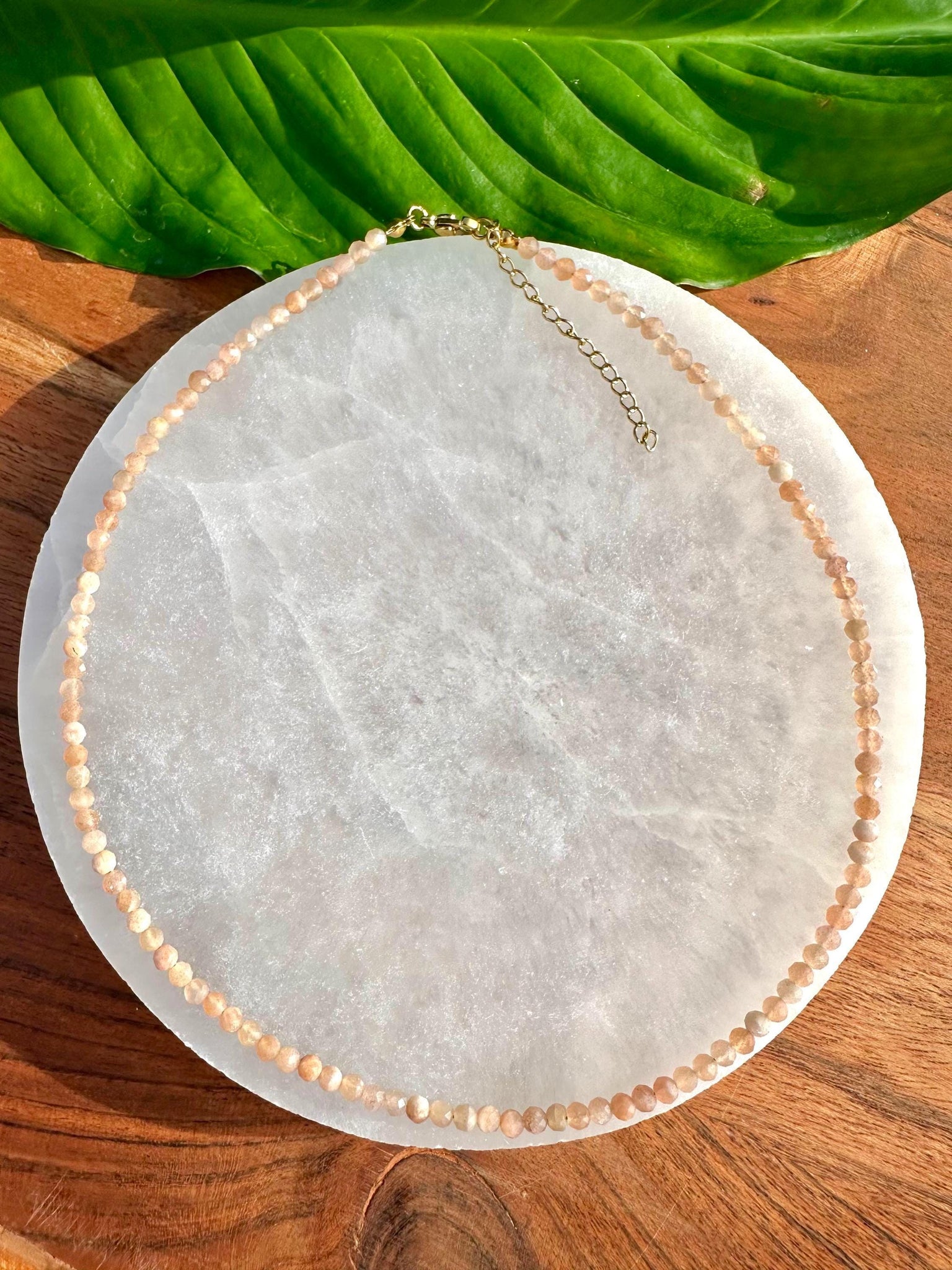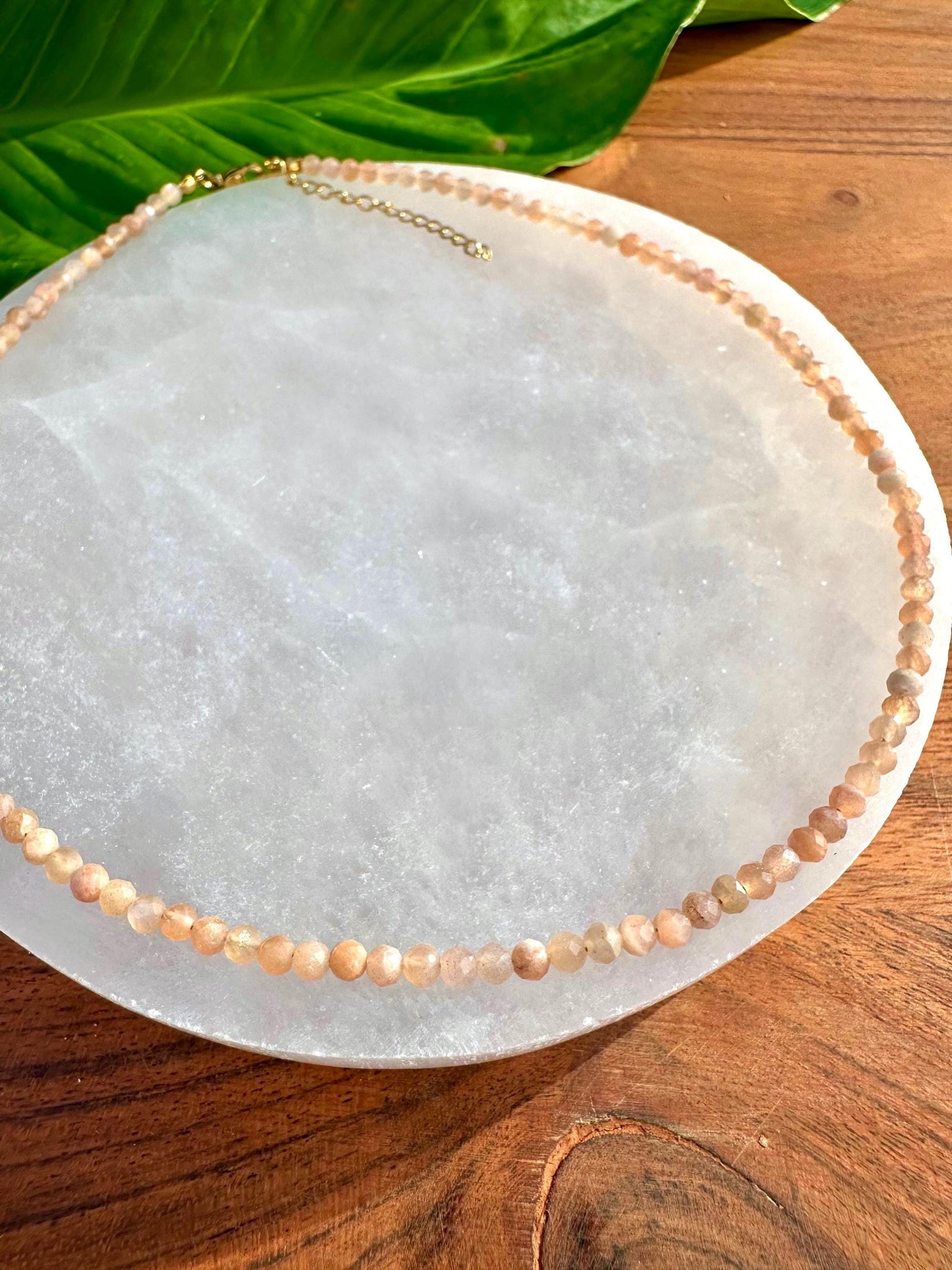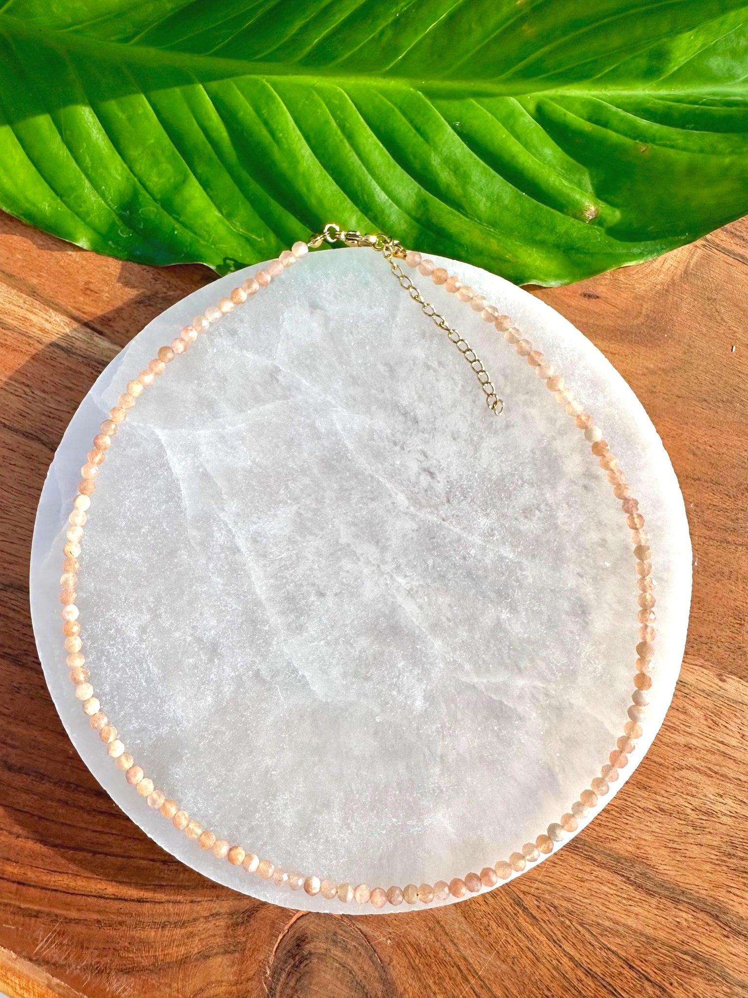 This Sunstone Crystal Necklace is made of 100% natural Grade A 2-3mm faceted beads. This necklace wears like a choker at 14 inches in length, resting at the base of the neck, just above the collarbone. It can be extended to 16 inches with a 2 inch extender according to your preference.