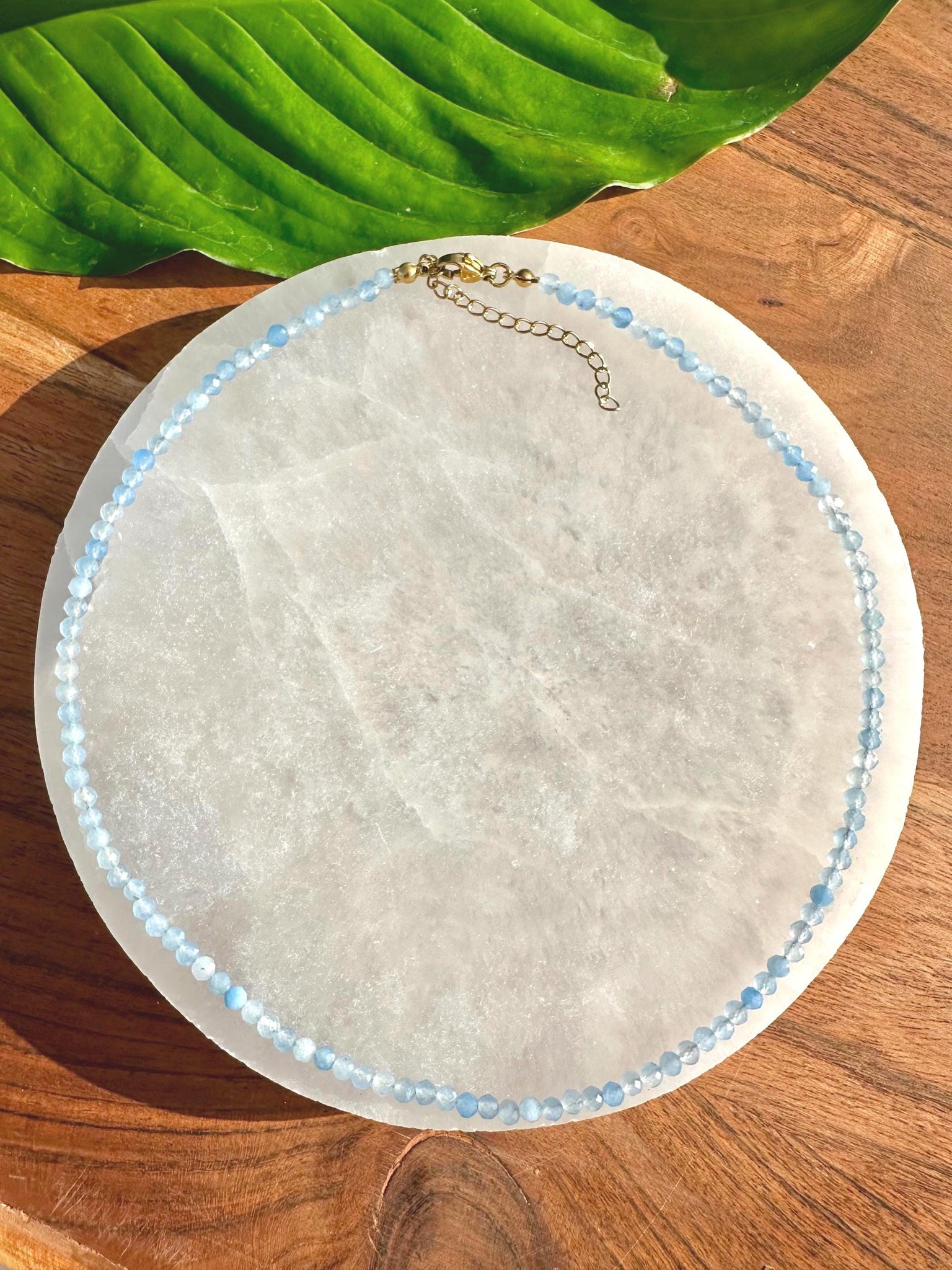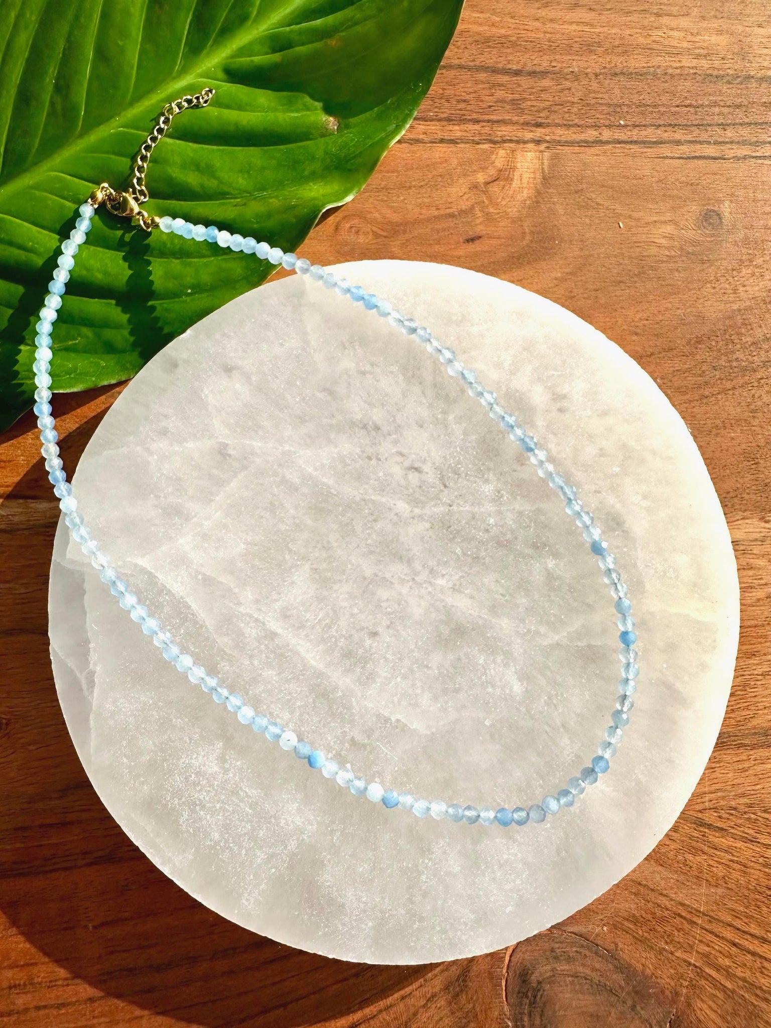 This Aquamarine Crystal Necklace is made of 100% natural Grade A 2-3mm faceted beads. This necklace wears like a choker at 14 inches in length, resting at the base of the neck, just above the collarbone. It can be extended to 16 inches with a 2 inch extender according to your preference.