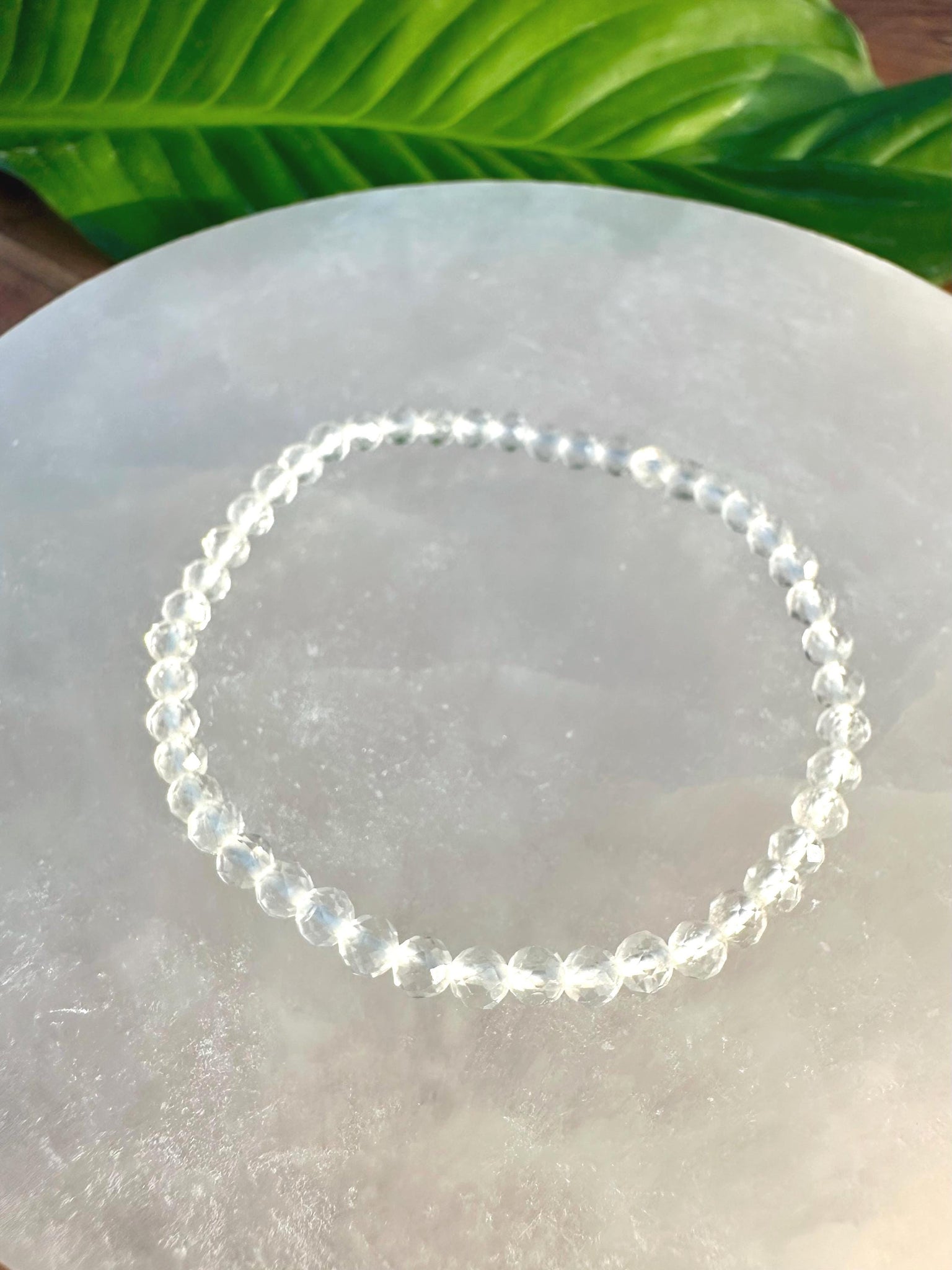 This Clear Quartz gemstone bracelet is made with 100% natural 4mm faceted crystal beads. This piece will fit all standard wrist sizes 5 1/2 - 7 inches and is made with a durable heavy-duty elastic cord.
